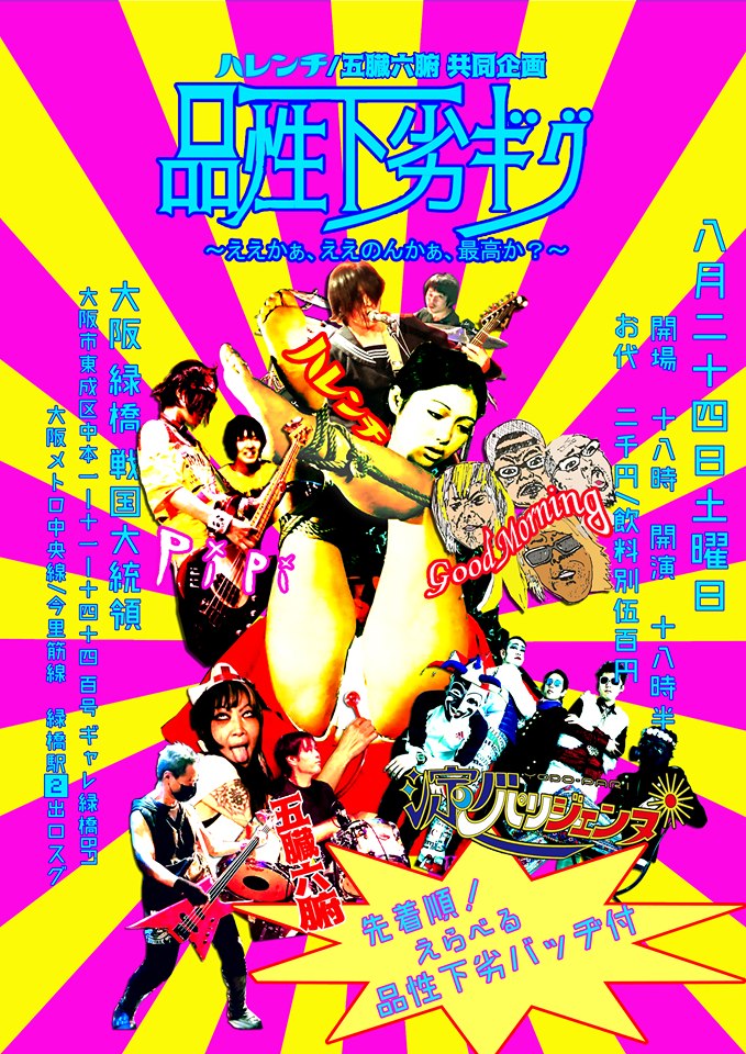 2019年8月24日(土) Tweet =ハレンチ+五臓六腑共同企画= 【品性下劣ギグ~ええか、ええのんか、最高か?~】 五臓六腑 PIPI 淀川パリジェンヌ Good Morning ハレンチ開場18:00 /開演18:30お代:2000円(+飲料代)※先着順でバッヂ進呈♫ 共有: クリックして X で共有 (新しいウィンドウで開きます) X Facebook で共有するにはクリックしてください (新しいウィンドウで開きます) Facebook いいね:いいね 読み込み中…