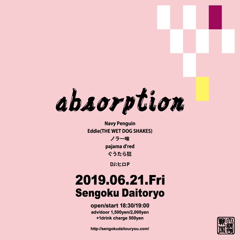 2019年6月21日(金) Tweet 『absorption』 Navy Penguinノラ一味ぐうたら狂pajama d’redEddie(THE WET DOG SHAKES)DJ:ヒロPOPEN/START 18:30/19/00ADV ¥1,500+1D¥500共有: クリックして X で共有 (新しいウィンドウで開きます) X Facebook で共有するにはクリックしてください (新しいウィンドウで開きます) Facebook いいね:いいね 読み込み中…