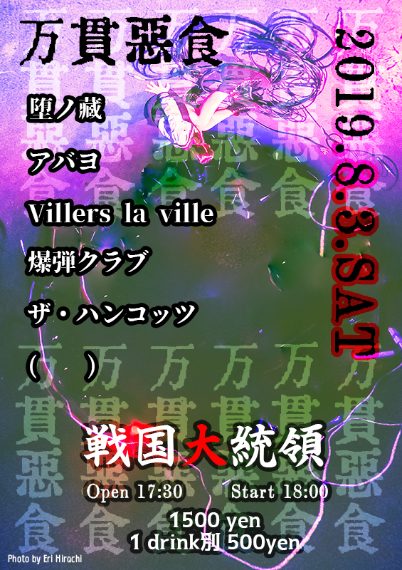 2019年8月3日(土) Tweet 【万貫悪食】 堕ノ藏アバヨVillers la ville爆弾クラブザ・ハンコッツ( ) Open17:30 Start18:00ADV¥1500 D別¥500 共有: クリックして X で共有 (新しいウィンドウで開きます) X Facebook で共有するにはクリックしてください (新しいウィンドウで開きます) Facebook いいね:いいね 読み込み中…