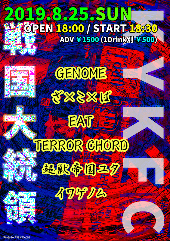 2019年8月25日(日) Tweet 【KYKFC】 GENOME ざxこxば EAT TERROR CHORD 超獣帝国ユタ イワゲノム ADV ¥1500(+1D別¥500) OPEN 18:00 START 18:30共有: クリックして X で共有 (新しいウィンドウで開きます) X Facebook で共有するにはクリックしてください (新しいウィンドウで開きます) Facebook いいね:いいね 読み込み中…