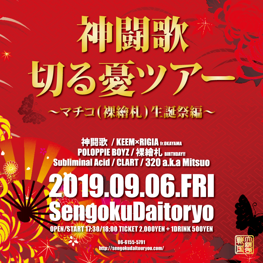 2019年9月6日(金) Tweet 神闘歌 切る憂ツアー ~ マチコ(裸繪札)生誕祭編 ~ 神闘歌(岡山)KEEM × RIGIA (岡山)裸繪札 (BIRTHDAY!!)POLIPPIE BOYZ Subliminal AcidCLART320TICKET 2000YEN + 1Drink(500YEN)OPEN 17:30 START 18:00共有: クリックして X で共有 (新しいウィンドウで開きます) X Facebook で共有するにはクリックしてください (新しいウィンドウで開きます) Facebook いいね:いいね 読み込み中…