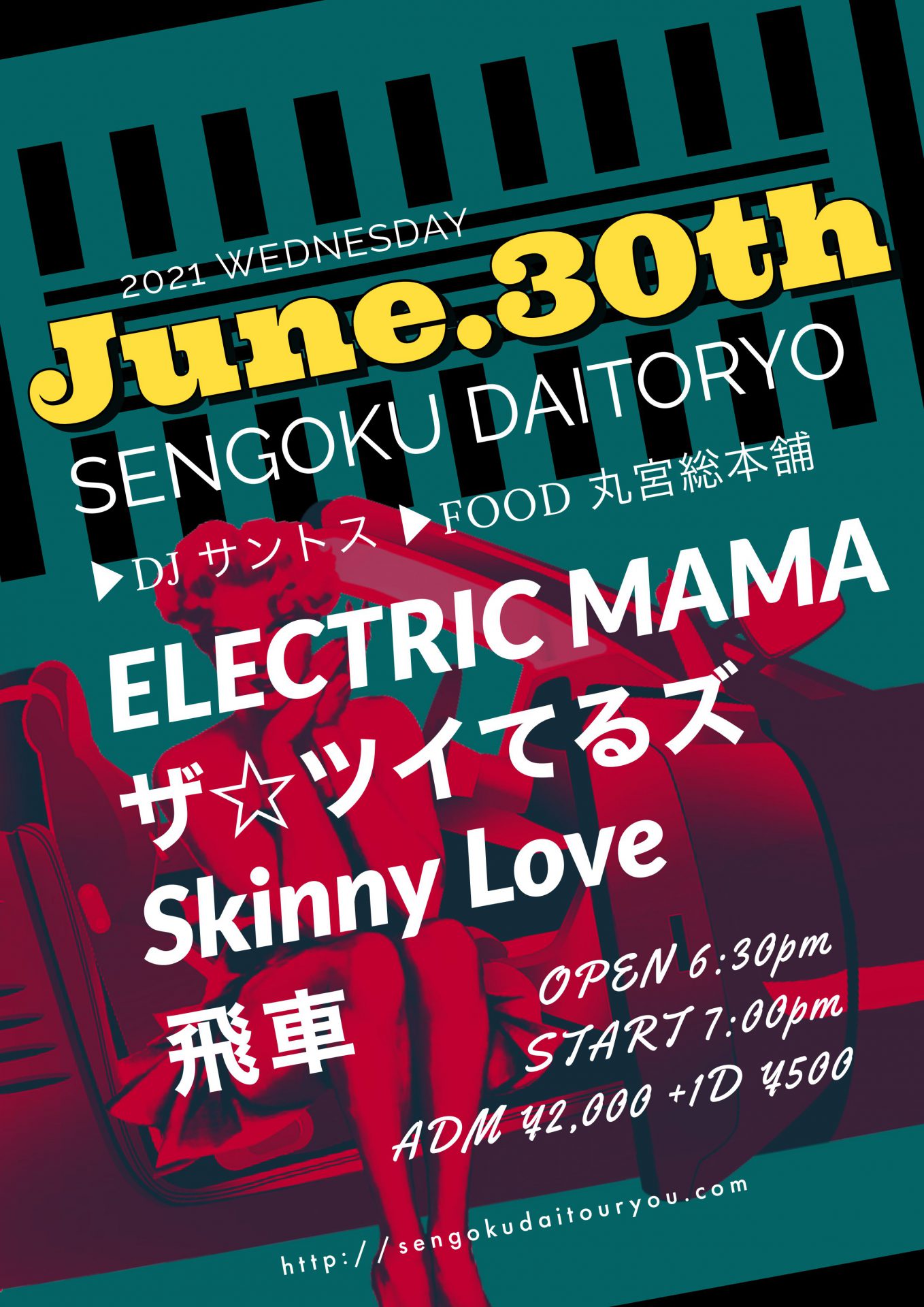 2021年6月30日(水) Tweet ▶︎LIVEELECTRIC MAMAザ☆ツイてるズSkinny Love飛車 ▶︎DJ サントス▶︎FOOD 丸宮総本舗 OPEN/START 18:30/19:00ADM ¥2,000 +1D ¥500共有: クリックして X で共有 (新しいウィンドウで開きます) X Facebook で共有するにはクリックしてください (新しいウィンドウで開きます) Facebook いいね:いいね 読み込み中…